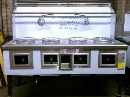 A Chinese wok burner is a specialised cooking equipment that provides high heat for stir-frying and other Asian-style cooking techniques. It typically features powerful burners that accommodate large woks for efficient food preparation.